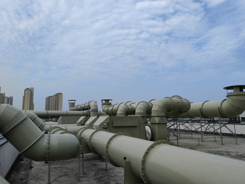 檢測室有機廢氣物 → 化學活化炭濾過器 → 引新風機 → 排卸